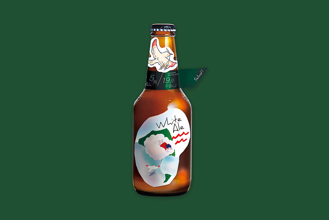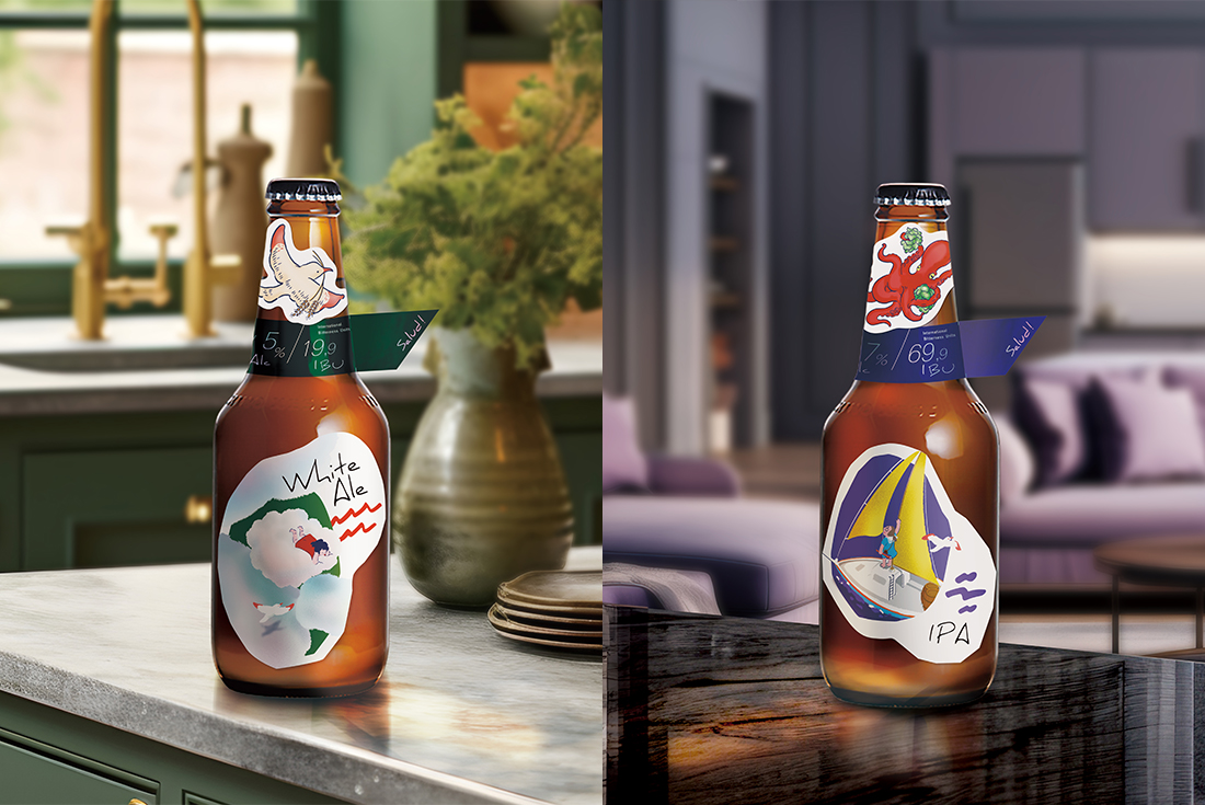 イベント用に製作したオリジナルビールのパッケージデザイン。ビールの中身もオリジナルで製作しました。「出会に乾杯!」というコンセプトで2つのビールがセットになっています。海の旅と空の旅を経験した2人が今同じ瞬間にグラスを交わす喜びと出会いの奇跡を表現しています。